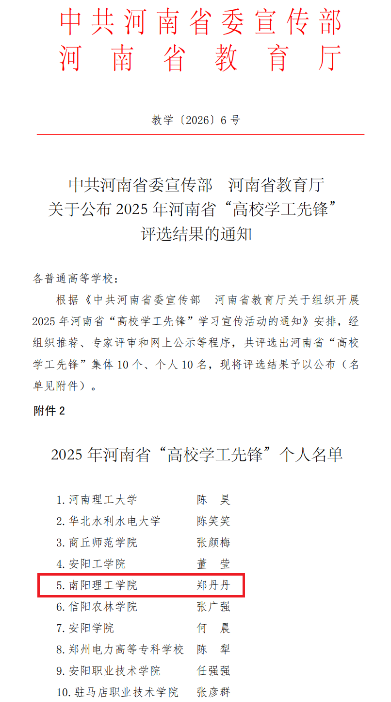 本网讯(特约记者/黄晨)近日,中共河南省委宣传部、河南省教育厅联合下发《关于公布2025年河南省“高校学工先锋”评选结果的通知》,我校传媒学院辅导员郑丹丹凭借全面过硬的业务素质和工作成效,经学校推荐、现场答辩、实地考察等环节,荣获河南省“高校学工先锋”称号(个人)。