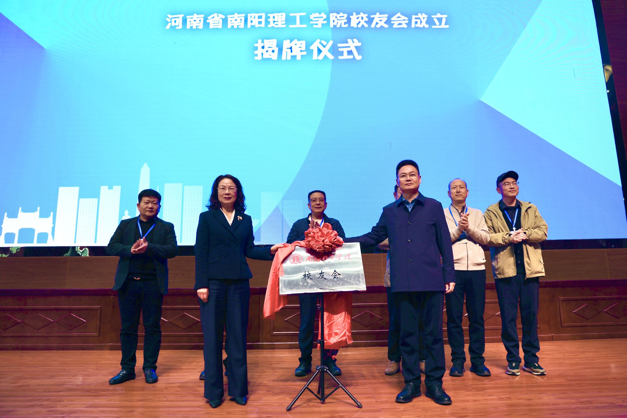 张爱红、郝好山共同为校友会揭牌。南阳校友会会长华文海、郑州校友会会长张克奇、深圳校友会会长李峥、杭州校友会会长石洪岭、义乌校友会会长强敬开、上海校友会会长袁森上台共同见证这一重要时刻。