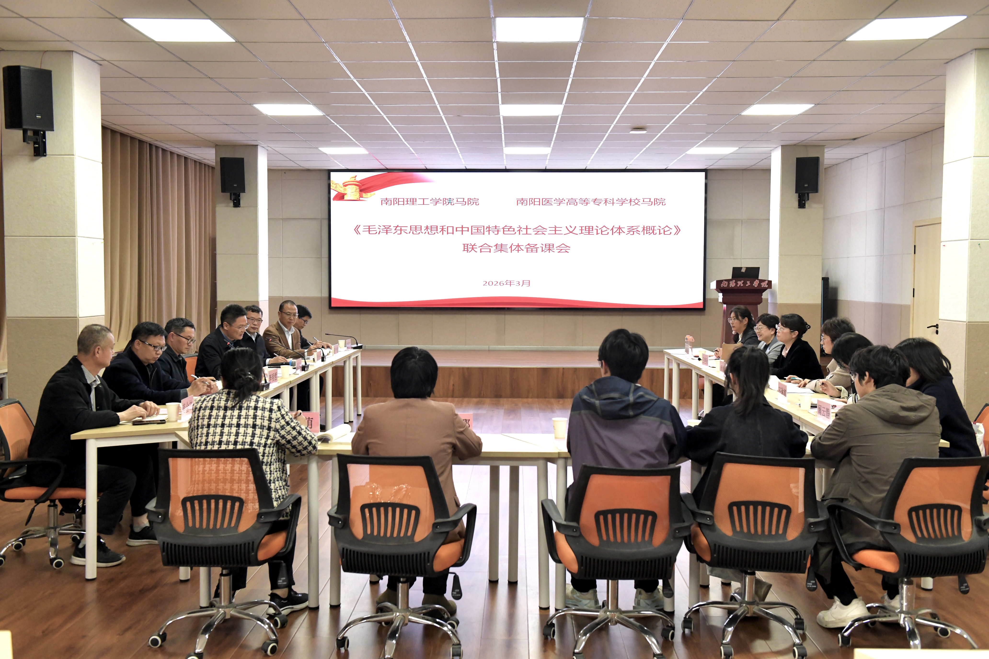 本网讯(特约记者/赵政)3月31日下午,校长郝好山、副校长黄金书深入马克思主义学院调研,并参加《毛泽东思想和中国特色社会主义理论体系概论》课程集体备课会。党委宣传部、教务处相关负责人,马克思主义学院领导班子成员,校院两级教学督导组成员,南阳医学高等专科学校马院院长李明哲,专业课教师代表参加集体交流,学校全体专职思政课教师和学生代表参加集体备课。
