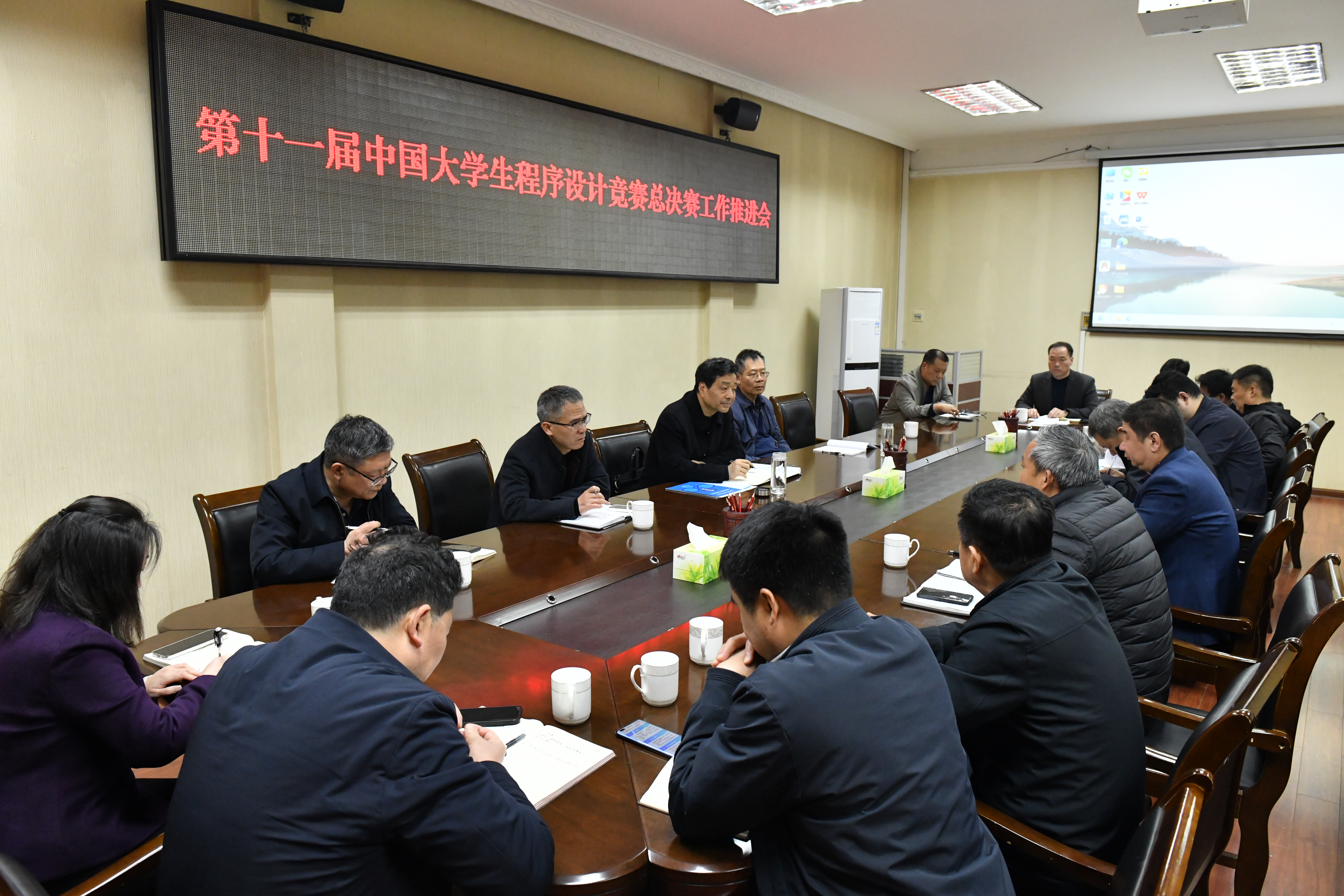 本网讯(记者/肖邓华) 4月1日上午,学校在第一会议室召开第十一届中国大学生程序设计竞赛总决赛工作推进会。校党委副书记、工会主席董豪,纪委书记、监察专员于继武出席会议,党政办公室、党委宣传部、统战部、财务处、学生处、招生就业处、保卫处、团委、后勤服务中心、数字媒体与艺术设计学院、教师教育学院、体育教学部、信息化建设与管理中心、计算机与软件学院等单位负责人参加会议。