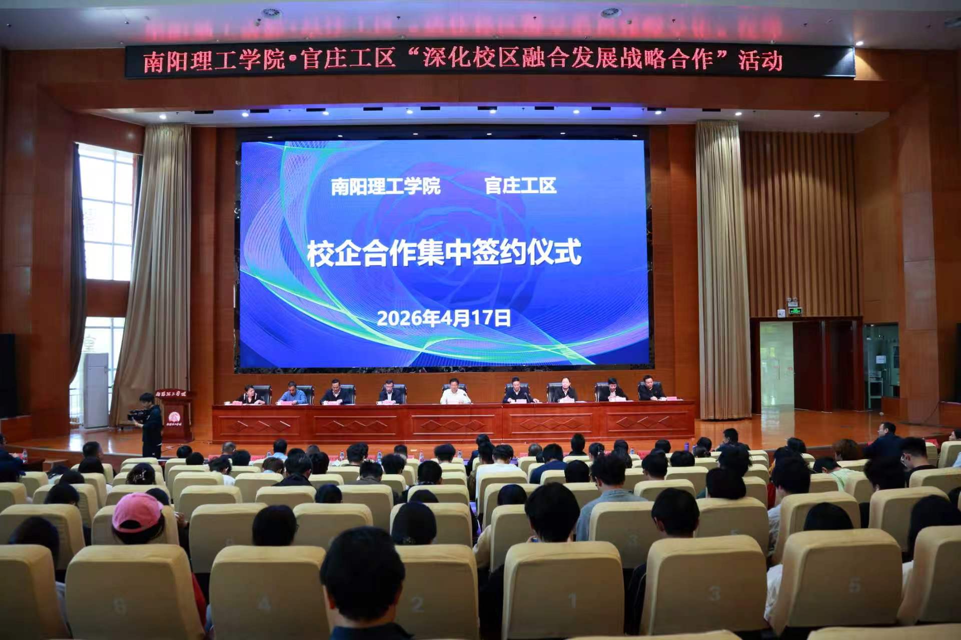 本网讯(特约记者/梁瀚余 学生通讯员/陈佳镓 李美佳)4月17日,南阳理工学院·官庄工区“深化校区融合发展战略合作”活动暨校企合作集中签约仪式在我校第三报告厅举行。南阳理工学院校长郝好山、副校长黄金书,官庄工区党工委书记高增伟,南阳市科技创新暨科技成果转化促进中心主任刘怀举出席仪式。校地合作管理与服务中心负责人、官庄工区相关部门负责人、13家重点企业代表和生物与化学工程学院师生代表参加活动。生物与化学工程学院负责人主持。