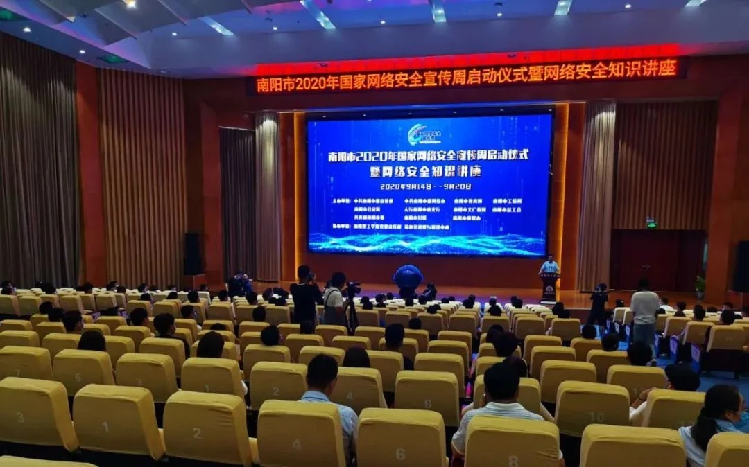 本网讯(学生记者/王锦丽 常志军 李娜娜)9月14日上午,南阳市2020年国家网络安全宣传周启动仪式暨网络安全知识讲座在我校第三报告厅举行。市委常委、宣传部长张富治,市政府副市长石秀田,校党委书记刘荣英等领导出席启动仪式,市直有关单位、市委网信委成员单位负责同志及师生代表共同参加活动。石秀田主持启动仪式。