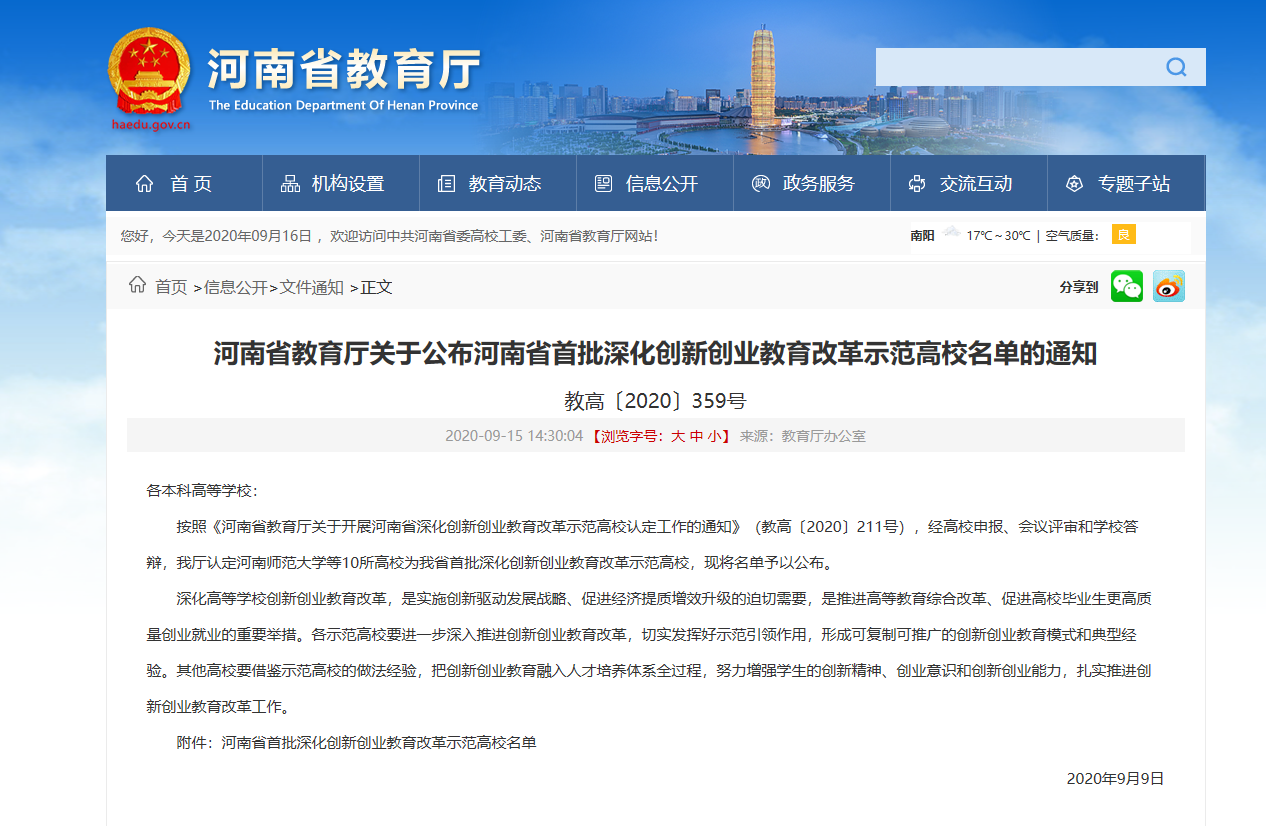 本网讯(学生记者/王锦丽)9月15日,河南省教育厅公布了《河南省首批深化创新创业教育改革示范高校名单》,我校获评首批省级深化创新创业教育改革示范高校。获评“示范高校”是对我校深入推进创新创业教育改革工作的认可和肯定,也是检验我校教学、管理水平的重要指标之一。