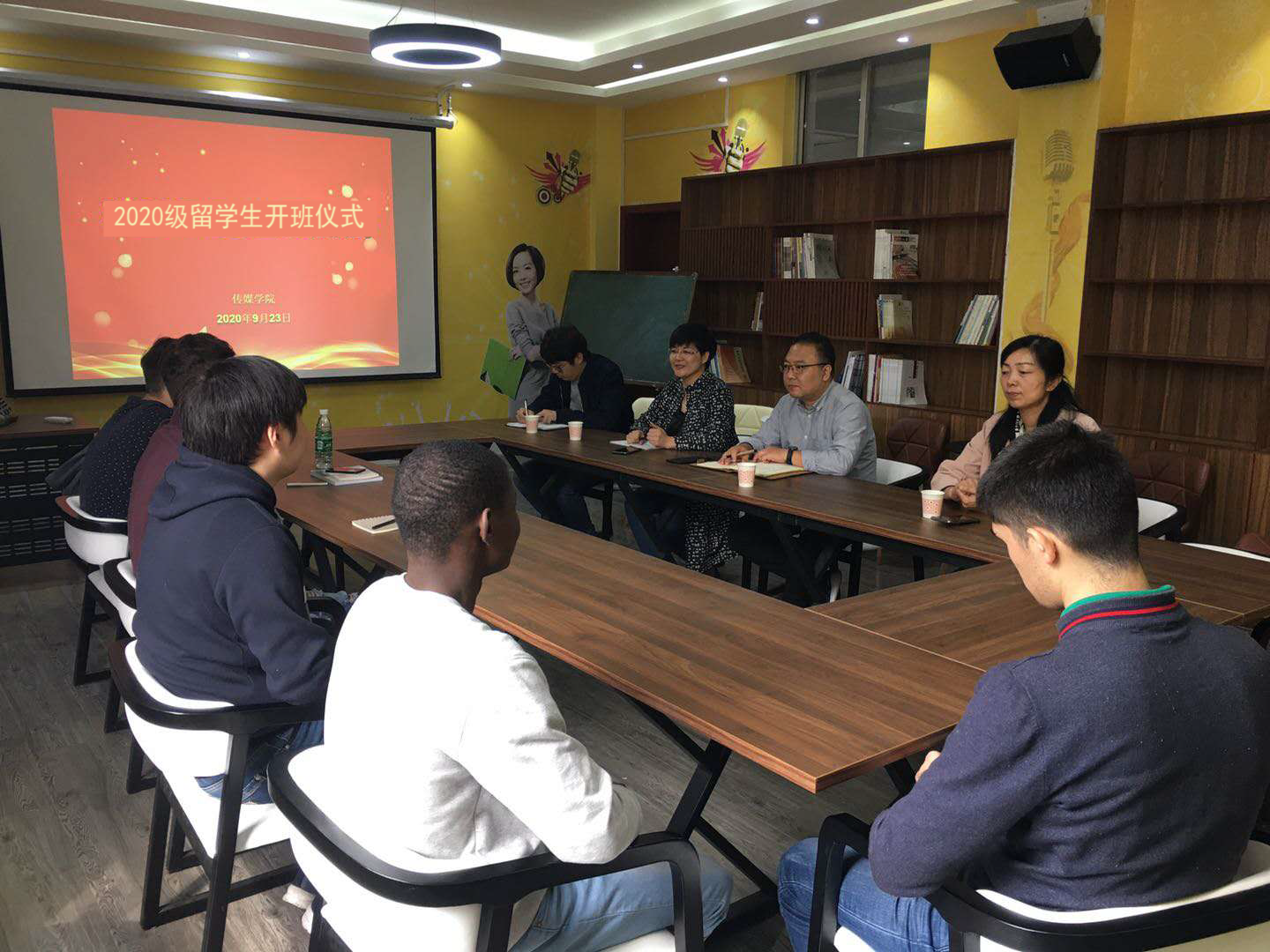 本网讯(特约记者/王焕玲)9月23日上午,我校举行2020年度来华留学生语言研习班开班仪式,传媒学院院长李存、国际交流合作中心副主任高东晓和来华留学生新生代表参加开班仪式。