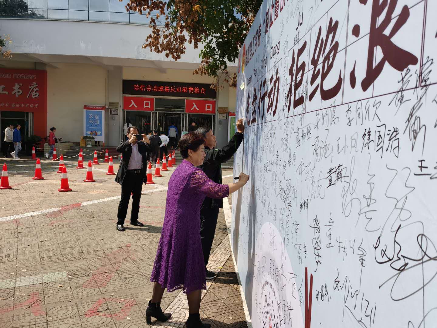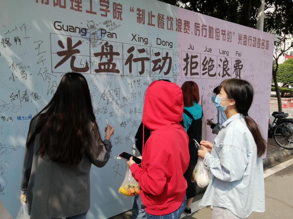 活动以“制止餐饮浪费,厉行勤俭节约”为主题,倡导师生树立浪费可耻、节约光荣的理念,在餐厅门口设置“光盘行动 拒绝浪费”巨幅签名墙,吸引众多师生前来参与。生物与化学工程学院吕晋同学签名后说:“我们应该自觉把艰苦奋斗、勤俭节约的理念内化于心、外化于行,从点滴做起,从就餐开始,将口号变为行动,将行动化为习惯,把节俭新风融入学习生活点滴间”。