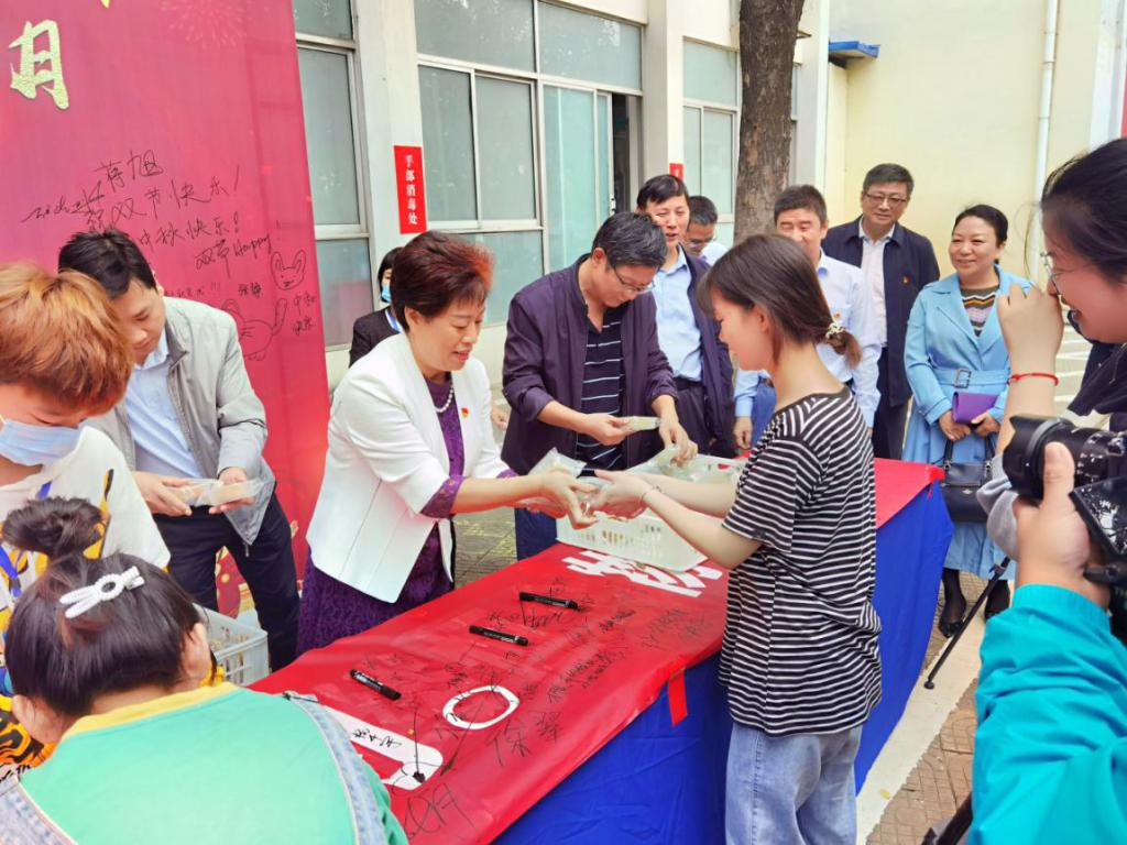 仪式结束后,到场领导及学生代表纷纷到签名墙签下姓名,以此响应“节约粮食,杜绝浪费”主题活动。刘荣英一行来到学苑餐厅广场为同学们发放中秋节学校定制款月饼,并进入食堂检查查看学生餐厅、教工餐厅“节约粮食杜绝浪费”相关制度及措施落实情况和宣传氛围营造工作,随后在学生餐厅和学生一起共进午餐,了解学生在校生活,亲身带领学生响应光盘行动。(审核/高芳放)