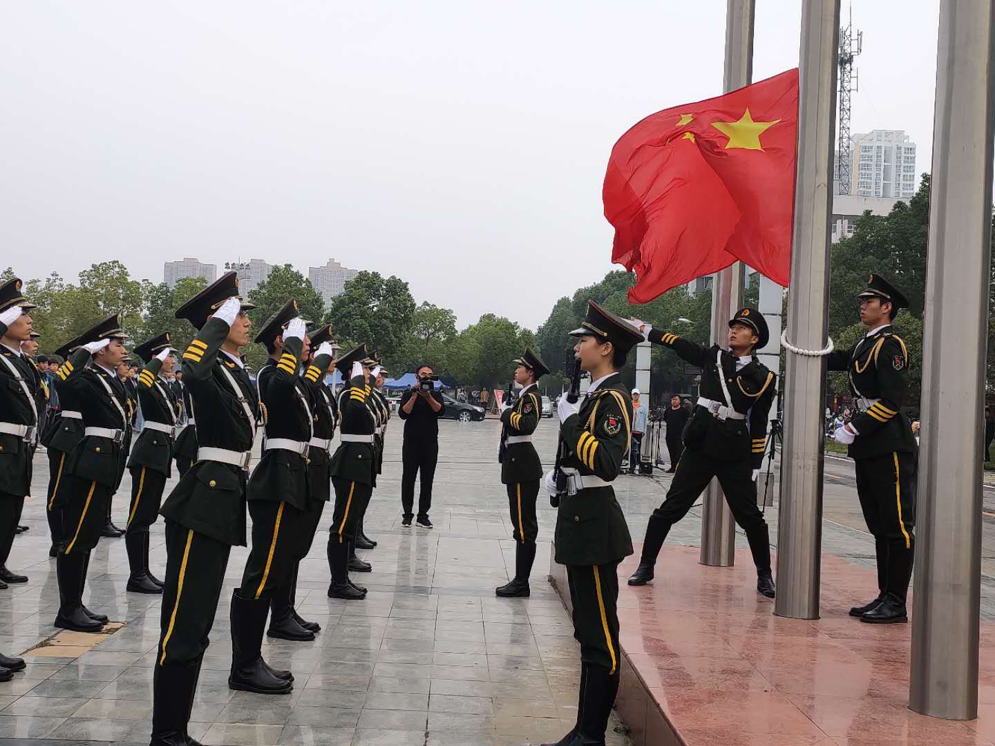 早上8时,校国旗护卫队的旗手们迈着庄严整齐的步伐护卫国旗入场。随着,雄壮的国歌响起,鲜艳的五星红旗冉冉升起,全体师生行注目礼并齐唱国歌。