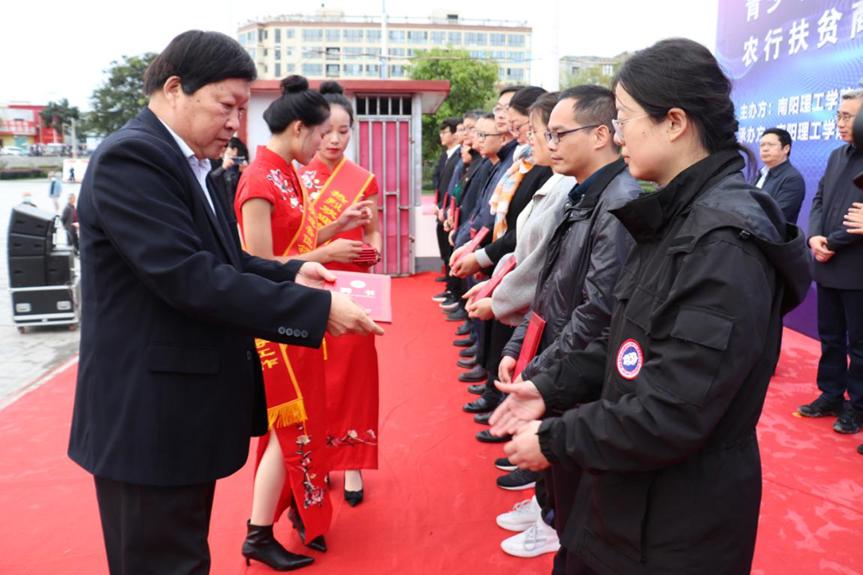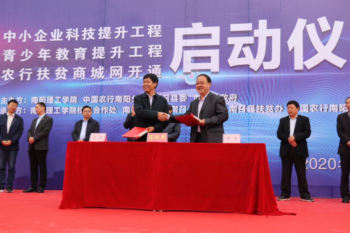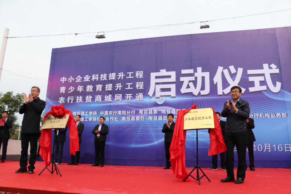 当日上午,由南阳理工学院、中国农行南阳分行、南召县委县政府主办的中小企业科技创新提升工程、青少年教育提升工程和农行扶贫商城网开通揭牌启动仪式在南召县滨河公园广场成功举办。