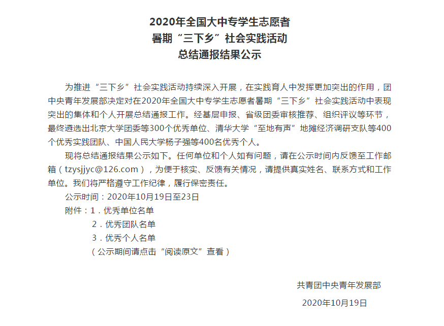 本网讯(特约记者/陈飞)日前,团中央公布了2020年全国大中专学生志愿者暑期“三下乡”社会实践活动评比结果,我校团委荣获2020年全国大中专学生志愿者暑期“三下乡”社会实践活动优秀单位。
