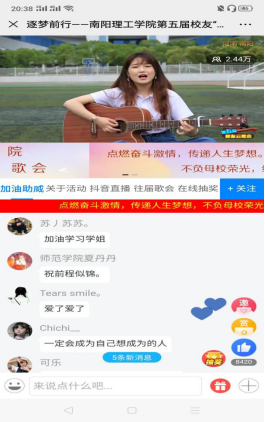 第五届云歌会充分运用了时下极具传播力的社交媒体,首次采用校招生就业处、校友联谊总会官方微信公众号以及官方抖音号,双通道同步直播的形式!校友们通过官方微信公众号收看了云歌会的全程直播,还纷纷进入官方抖音号,与“南工小招”进行了亲密互动。