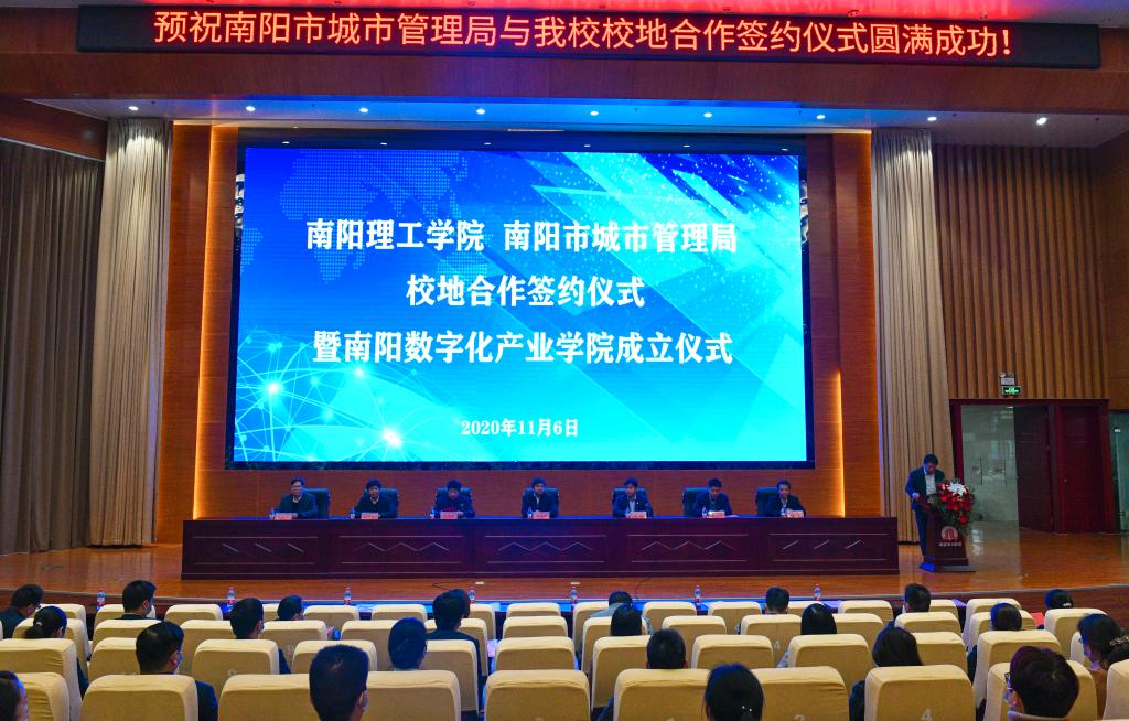 肖泽昌在致辞中指出,我校始终把服务南阳社会经济发展作为学校义不容辞的责任,坚持“植根南阳、立足河南、面向全国”,持之以恒走产教融合、校地合作的开放办学之路。我校与南阳市城市管理局共同组建南阳数字化产业学院,本着“互惠双赢、共同发展”的原则,充分发挥双方的优势,促进校地合作与科研成果转化,助推南阳数字化产业的发展。我校将以此次合作为契机,积极探索校地合作的长效机制,进一步落实国家科教兴国战略,在更宽的领域、更深的层次、更高的水平上,开展更为全面的深度合作,为南阳市大数据战略实施提供强有力的人才支撑。