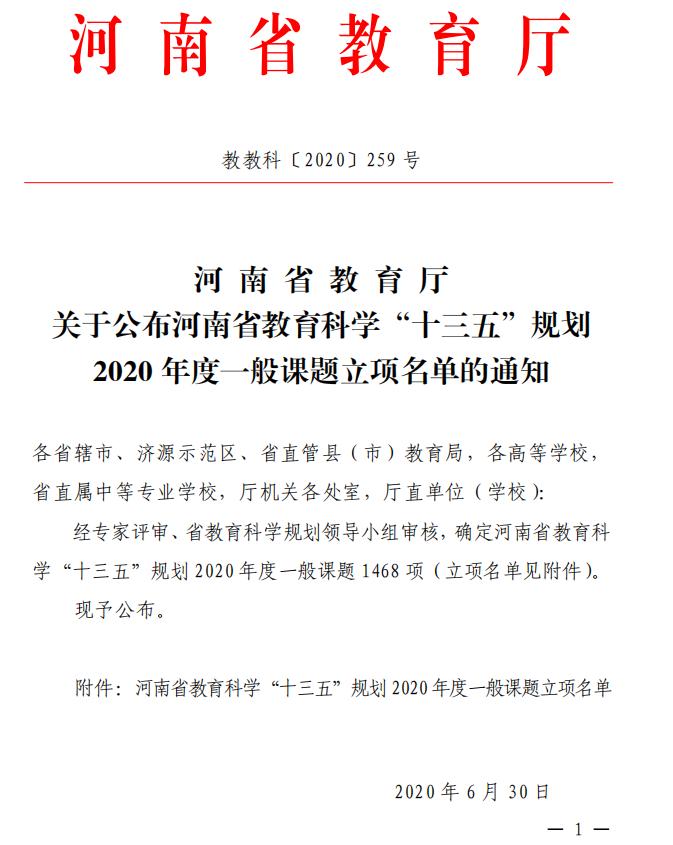 本网讯(特约记者/赵玉军)近日,省教育厅印发《关于公布河南省教育科学“十三五”规划2020年度一般课题立项名单的通知》,我校马克思主义学院、计算机与软件学院、范蠡商学院、张仲景国医国药学院教师申报的6项课题获准立项。