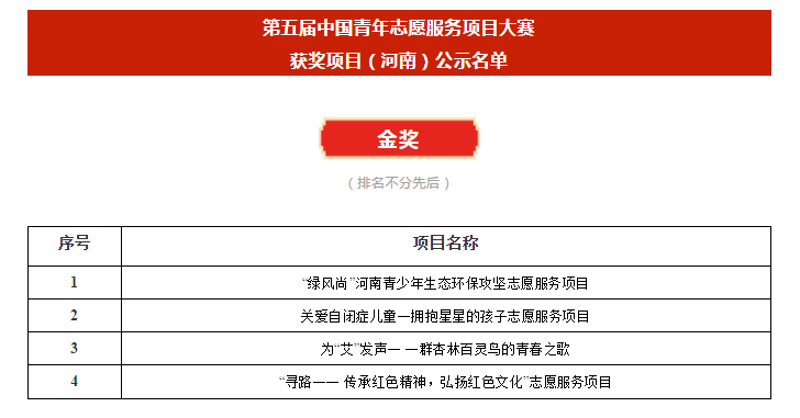 据悉,第五届中国青年志愿服务项目大赛组委会从38个省级赛会单位和行业赛主办单位推报的1202个项目,经过全国赛初评评审,共有1000个项目进入终评评审,最终评审金奖项目150个,银奖项目350个,铜奖项目500个,其中河南省获得第五届中国青年志愿服务项目大赛4个金奖,10个银奖,18个铜奖。