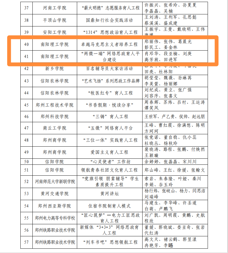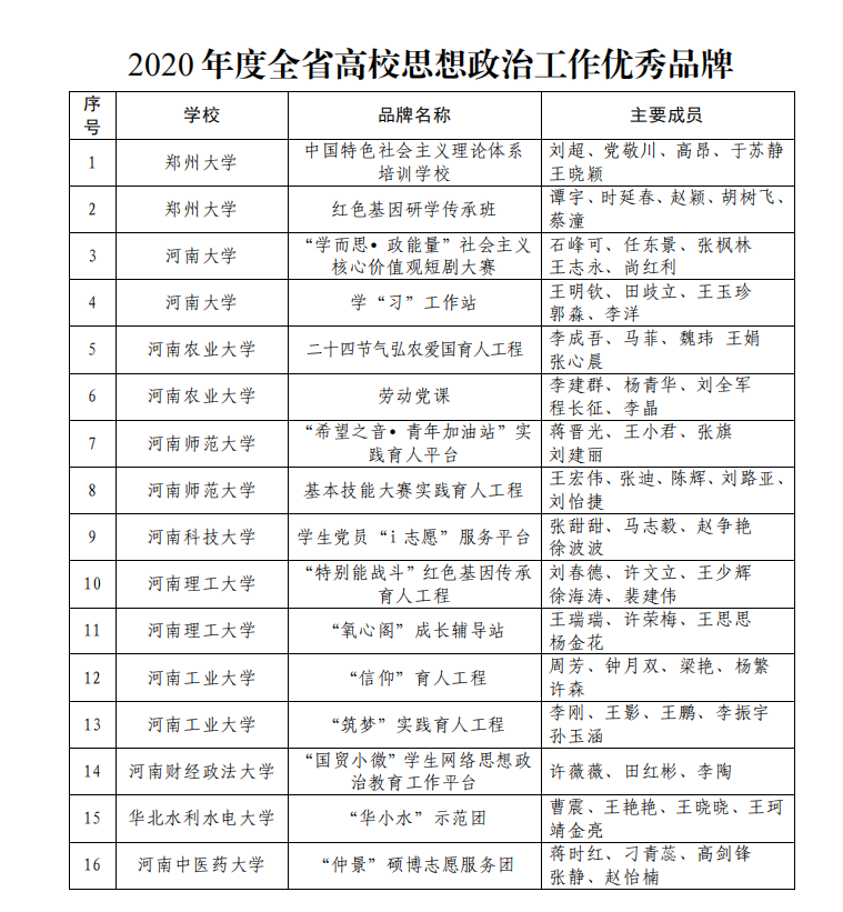 本网讯(记者/刘庚 学生记者/张文飞 李雯婷)近日,中共河南省委高校工委、省教育厅联合下发《关于公布2020年度全省高校思想政治工作奖评审结果的通知》,公布了2020年度“全省高校思想政治工作优秀品牌”评选结果。我校“卓越马克思主义者培养工程”和“‘两微一端’网络思政育人平台建设”被评为2020年度全省高校思想政治工作优秀品牌。