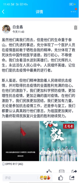 外国语学院教师吕柯在朋友圈这样说:“Many of us are here,because you have gone away.We are united more firmly,because we lost your company.China has become a better place because of your dedication and sacrifice.We need,miss you,and cannot afford to lose you.Rest in Peace,Heros.”