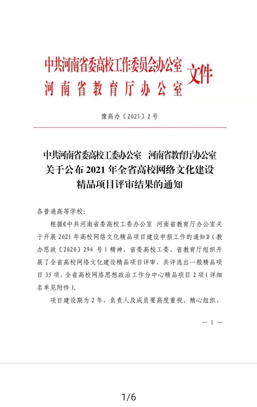 经过多年培育和建设,我校网络文化建设管理工作成效明显。2017年我校入选河南省高校网络文化建设首批10所试点学校;2017年至2021年7个项目连续被立项为河南省高校网络文化建设精品项目;2020年,党委委员、宣传部长高芳放教授入选河南省首批网络教育名师(全省仅10名);《“两微一端”网络育人平台》获河南省高校思想政治工作优秀品牌。官方微信2016、2017年度连续两年获得河南省高校十佳新媒体平台。官微团队获2018年度河南省大学生新青年讲故事演讲比赛一等奖。(校对/王小婉 审核/高芳放)