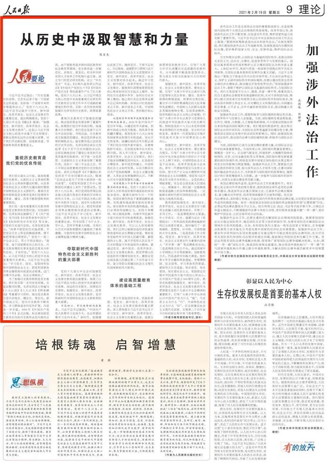 党的十八大以来,习近平总书记就学习党史、新中国史、改革开放史、社会主义发展史作出重要论述、提出明确要求。党的十九届五中全会《建议》强调:“加强党史、新中国史、改革开放史、社会主义发展史教育”。2月19日,教育部党组书记、部长陈宝生在人民日报发表署名文章《从历史中汲取智慧和力量》。