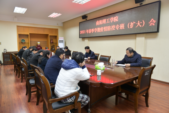 本网讯(记者/鲁静薇)3月7日,我校2021年春季学期疫情防控专班扩大会在第一会议室召开。党委副书记、工会主席张伟主持会议,副校长张世海、王玉磊出席会议,党政办、党委宣传部、人事处、教务处、学生处、校医院、国际交流合作中心、实验室建设管理运营中心、信息化建设与管理中心、心理健康教育中心、后勤中心单位负责人及相关人员参加会议。