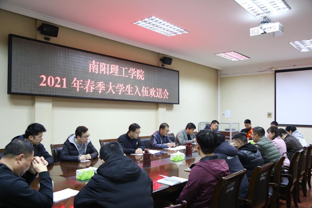 本网讯(特约记者/王吉春)3月15日下午,我校2021年春季大学生入伍欢送会在中込会馆第一会议室隆重举行。党委学生工作部、人民武装部全体人员、各学院负责老师、光荣入伍的大学生及退役大学生代表40余人参加会议。