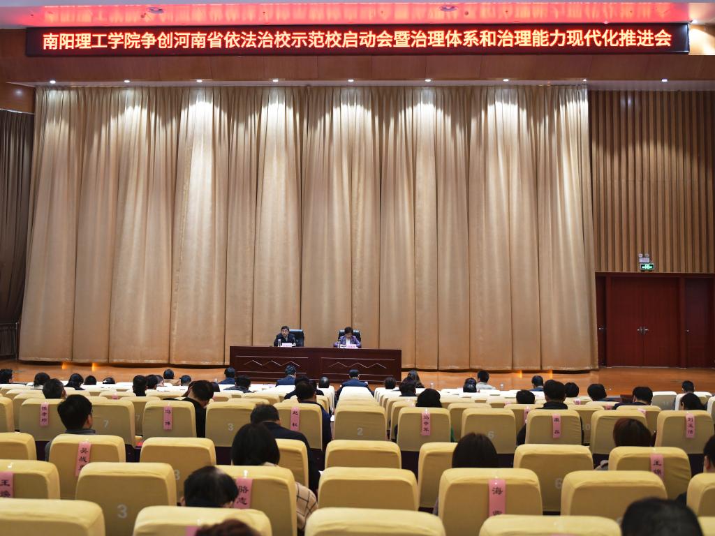 本网讯(特约记者/王冷)3月31日下午,我校在第三报告厅召开争创河南省依法治校示范校启动会暨治理体系和治理能力现代化推进会。校党委书记刘荣英,校长安士伟,党委副书记秦鹏鸣,党委副书记、工会主席张伟,副校长肖泽昌、张爱红、王玉磊、郝好山出席会议。全体中层干部参加会议。