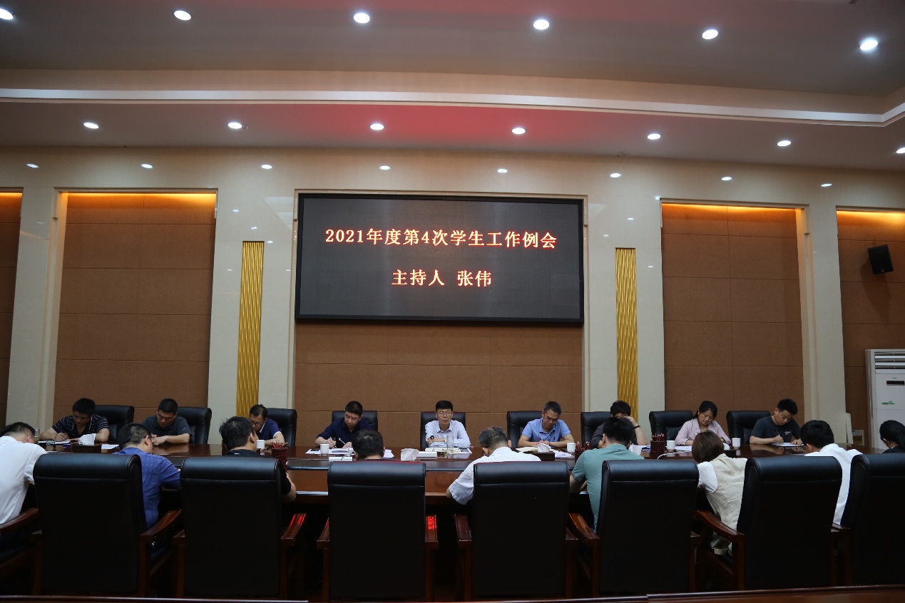 本网讯(特约记者/张启鑫)5月10日下午,校党委副书记、工会主席张伟主持召开我校2021年度第4次学生工作例会。学生处、团委、心理健康教育中心、保卫处、后勤服务中心、校医院等部门主要负责人,各教学院党委副书记参加会议。