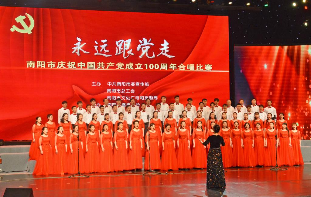 本网讯(特约记者/张磊)5月25日,在 “永远跟党走”南阳市庆祝中国共产党成立100周年合唱比赛上,我校参赛队演唱的《唱支山歌给党听》、《旗帜颂》荣获铜奖,校党委书记刘荣英参加比赛。