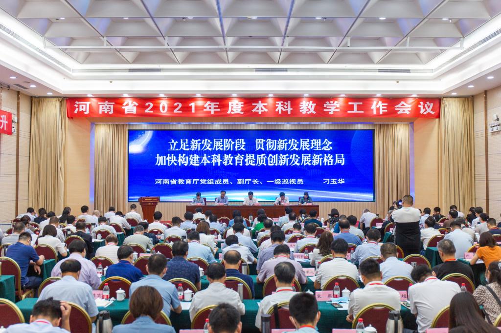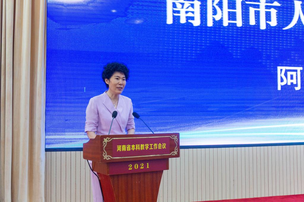 本网讯(记者/鲁静薇)5月31日—6月1日,河南省2021年度本科教学工作暨本科高校课程思政建设推进会在南阳召开。河南省教育厅党组成员、副厅长、一级巡视员刁玉华,南阳市人民政府副市长阿颖出席会议并讲话,河南省教育厅高教处处长张水潮,河南省高教学会秘书长吴长运,河南省教育厅高教处全体工作人员,全省本科高校分管教学工作的负责同志及教务处处长及我校党委书记刘荣英,校长安士伟,副校长葛晨光参加会议。