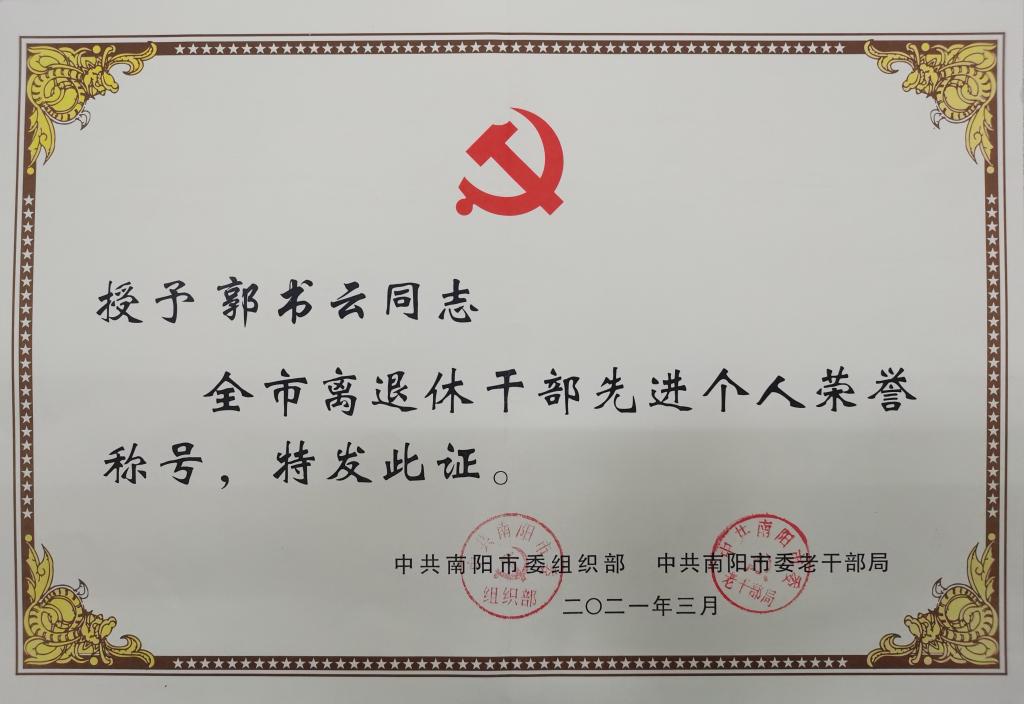 本网讯(特约记者/张晓红)近日,中共南阳市委组织部、中共南阳市委老干部局对全市离退休干部先进个人进行表彰,我校退休教师郭书云被授予“全市离退休干部先进个人”称号。