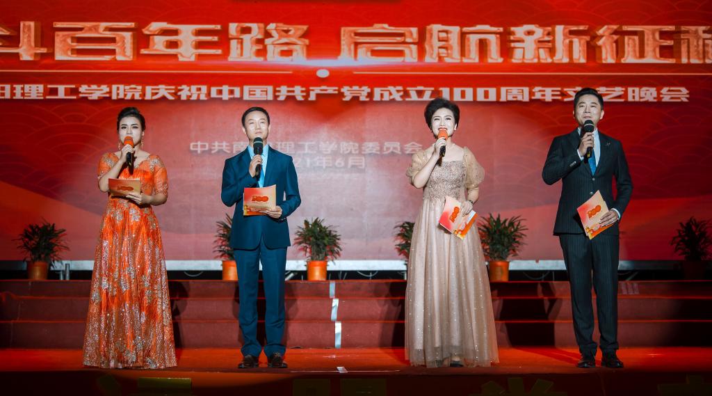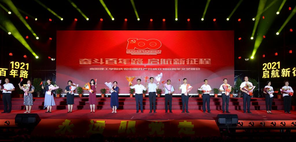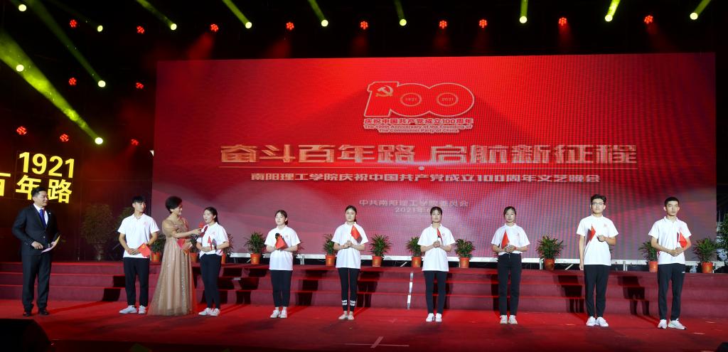 雄壮激昂的大合唱《没有共产党就没有新中国》,拉开了南阳理工学院庆祝中国共产党成立100周年文艺晚会帷幕。作为学校党史学习教育和庆祝建党一百周年系列活动的重要组成部分,晚会以中国共产党的一百年光辉发展历程为主线,分为“开天辟地救中国、改天换地兴中国、翻天覆地富中国、惊天动地强中国”四个篇章。中国共产党波澜壮阔的一百年征程,以磅礴的气势,浓墨重彩地再现在师生的面前;党旗飘飘,党徽璨璨,中国共产党人可歌可泣的奋斗历史,浓缩在两个小时的华彩乐章中。