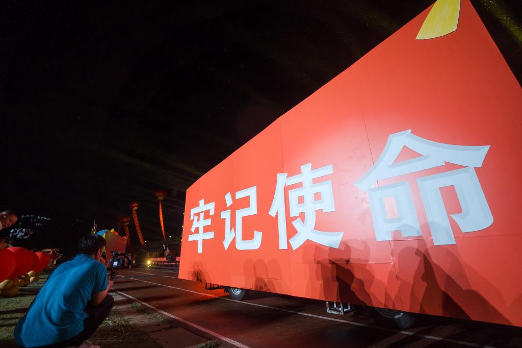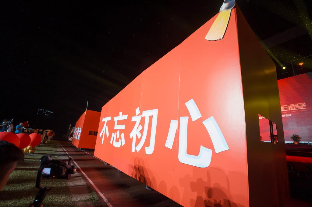 在晚会最后“走向复兴”的互动环节,南阳理工学院优秀学子、教职工团队、“两优一先”先进人物组成一个个方阵,在党旗、国旗、校旗和13个教学院院旗的引领下,阔步向前。“不忘初心、牢记使命”的红旗标语车和南工号巨轮闪亮登场,驶过观众席,上千个气球腾空而起,晚会在师生们欢呼声中圆满落下帷幕。(摄影/马田新 陈培杰 闫彬 校对/肖邓华 审核/高芳放 )