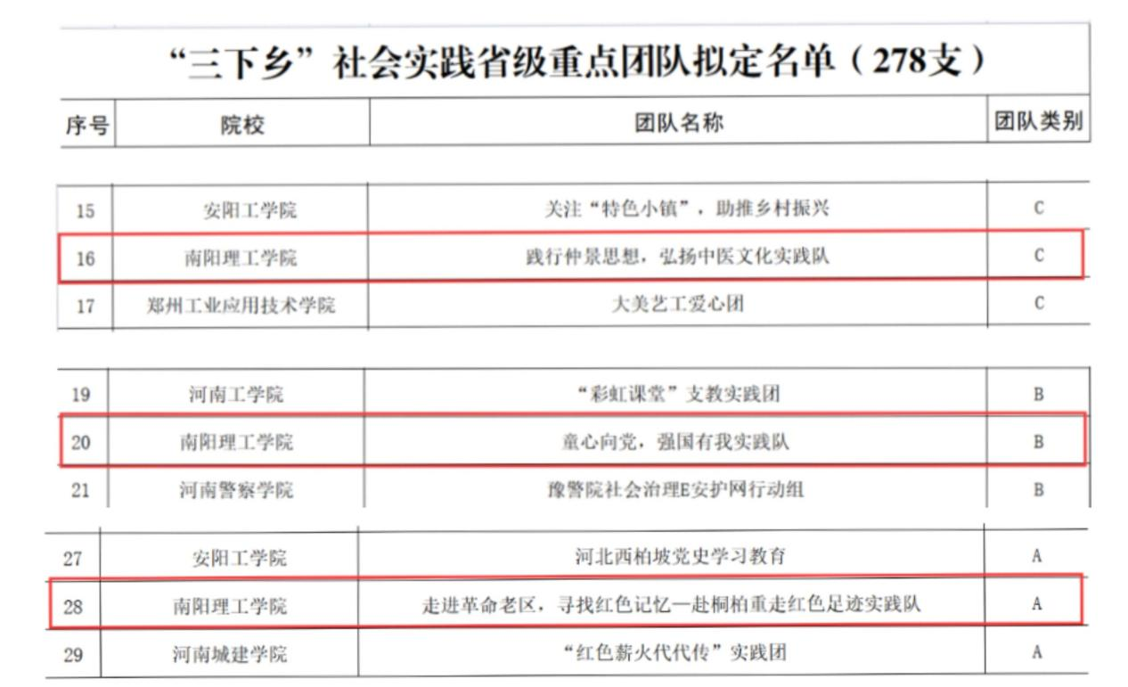 据悉,在2021年全省大中专学生志愿者暑期文化科技卫生“三下乡”社会实践活动中,经团省委在全省高校中层层遴选、推荐,最终我校范蠡商学院《爱水护水:践行“两山”理论 弘扬南水北调精神志愿服务队》成功入选团中央“三下乡”社会实践全国重点团队,张仲景国医国药学院《践行仲景思想,弘扬中医文化实践队》、计算机与软件工程学院《童心向党,强国有我实践队》、传媒学院《走进革命老区,寻找红色记忆—赴桐柏重走红色足迹实践队》3支团队成功入选团省委“三下乡”社会实践省级重点团队。(校对/鲁静薇 审核/肖邓华)