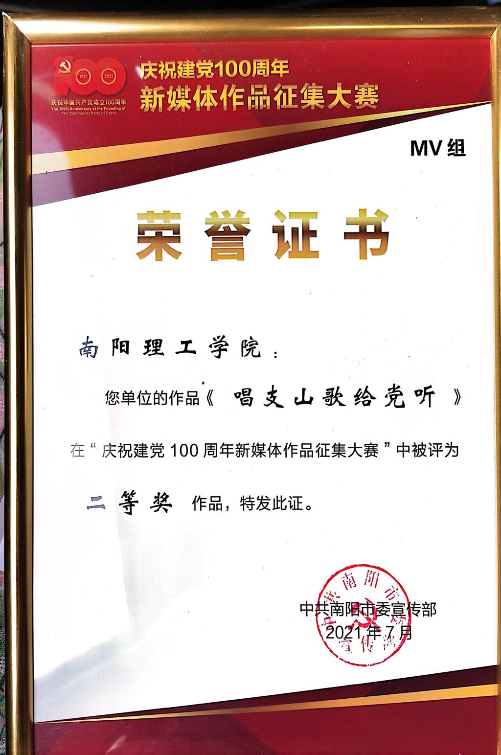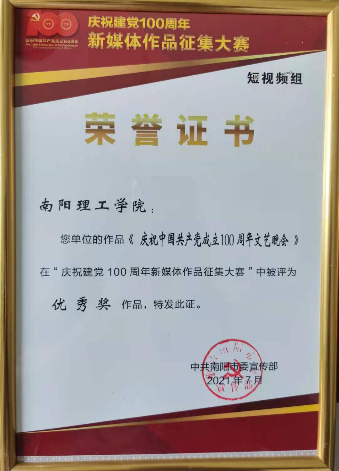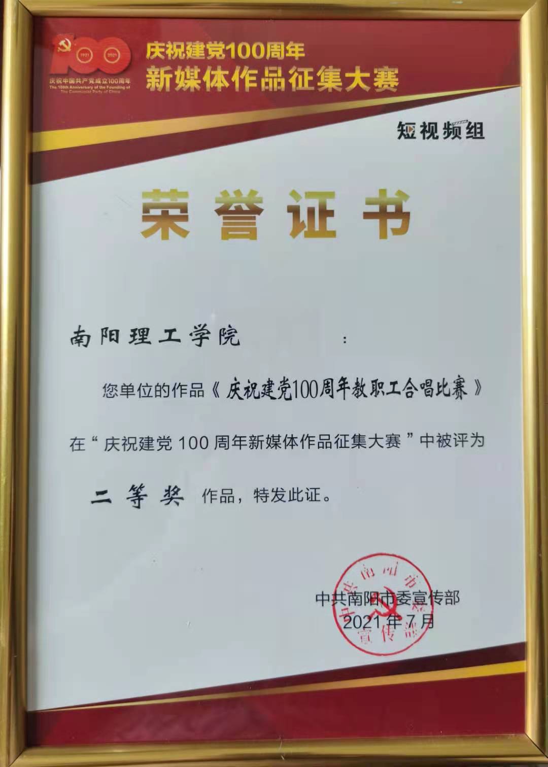 本网讯(记者/肖邓华) 8月5日下午,南阳市委宣传部庆祝建党100周年新媒体优秀作品颁奖仪式在南阳梅溪宾馆举行。我校报送的短视频《南阳理工学院庆祝建党100周年教职工合唱比赛》、MV《唱支山歌给党听》分别荣获二等奖,短视频《南阳理工学院庆祝中国共产党成立100周年文艺晚会》荣获优秀奖,我校荣获优秀组织奖。