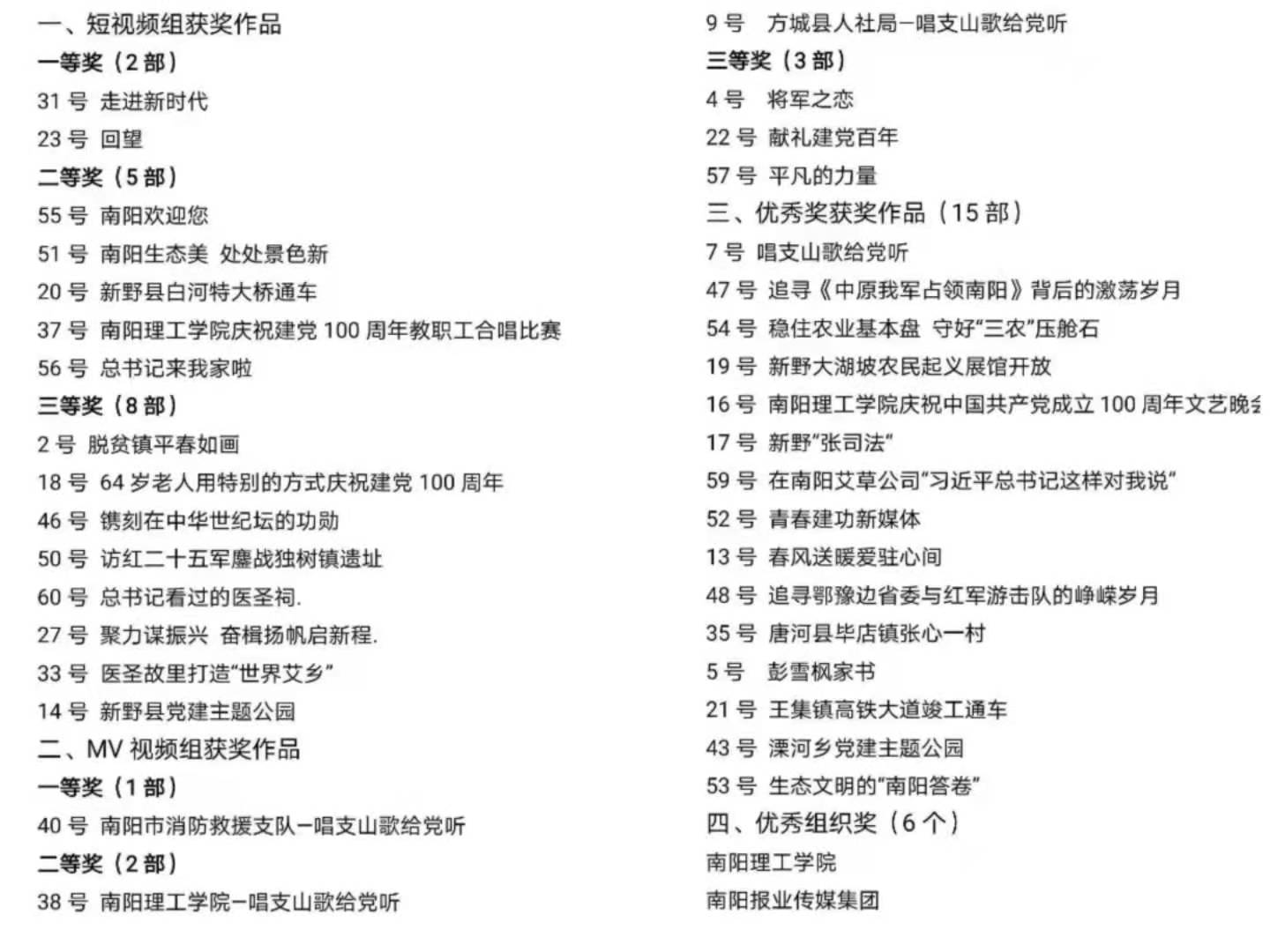 此次庆祝建党100周年新媒体作品征集大赛是由市委宣传部、市委网信办、市政府新闻办主办,南阳报业传媒集团、南阳广播电视台协办。自5月份启动以来,大赛共收到新媒体作品165部,经过初审、网上投票、专家评审三个阶段,共评选出优秀作品36部,其中短视频类一等奖2部、二等奖5部、三等奖8部,MV类一等奖1部、二等奖2部、三等奖3部,优秀奖15部,优秀组织奖6个。(校对/鲁静薇 审核/高芳放)