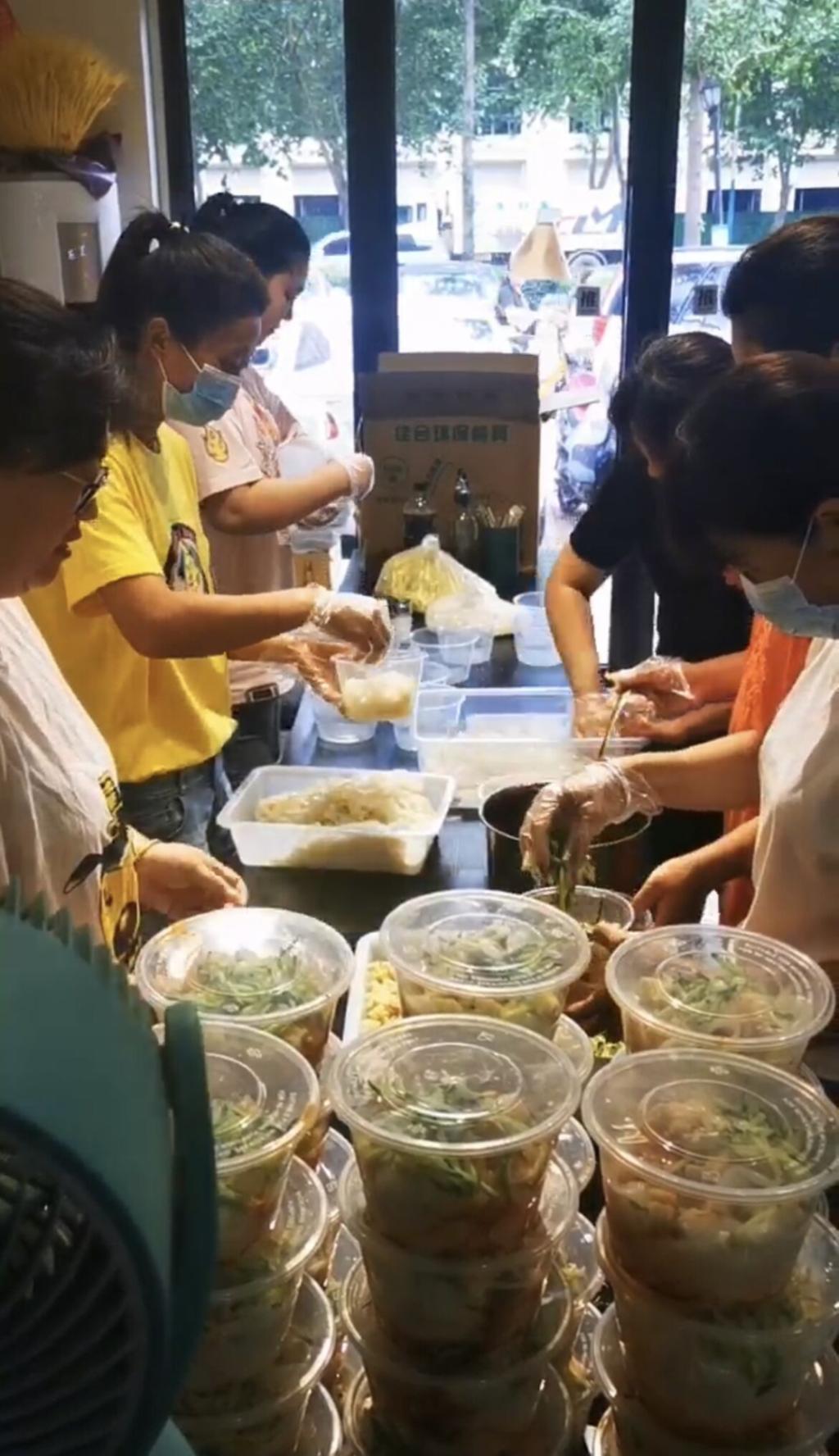 25日早上,徐兴强和姐姐五点多起床到店里开始准备食材。在店中,徐兴强独自将180个肉夹馍做好。并在附近的群众的帮忙下,做了126碗凉皮。大家把肉夹馍和凉皮送到支援新乡的志愿者手中,送到世青国际小学和育才小学丰华校区,分发给安置的受灾群众。