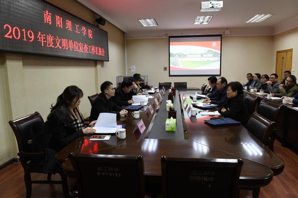 本网讯(记者/王虎 学生记者/王锦丽)12月12日下午,由河南省农科院机关党委专职副书记黎世民为组长,河南省教育厅思政处师胜祺、周口市教育体育局郝飞和安阳市文明办宣传教育中心郑皓宇为成员的2019年全省文明村镇、文明单位、文明校园第10考评组在南阳市委宣传部常务副部长、市文明办主任王兵和南阳市文明办副主任马蔼玲等陪同下,对我校全国文明单位创建工作复查验收。我校在中込会馆第一会议室召开汇报会,校领导邢勇、刘荣英、秦鹏鸣及校文明委全体成员参加。