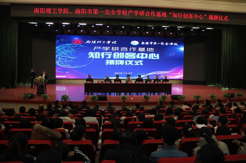 本网讯(特约记者/段新东)11月27日, 南阳理工学院、南阳市第一完全学校产学研合作基地“知行创客中心”揭牌仪式在市第一完全学校举行。副市长阿颖,校党委委员、副校长肖泽昌,卧龙区区长邓俊峰,市教育局副局长黄平,卧龙区委常委、统战部长张红岩,卧龙区政府党组成员、市第一完全学校校长王连照和计算机与信息工程学院主要负责人等出席揭牌仪式。肖泽昌与王连照共同为“知行创客中心”揭牌。