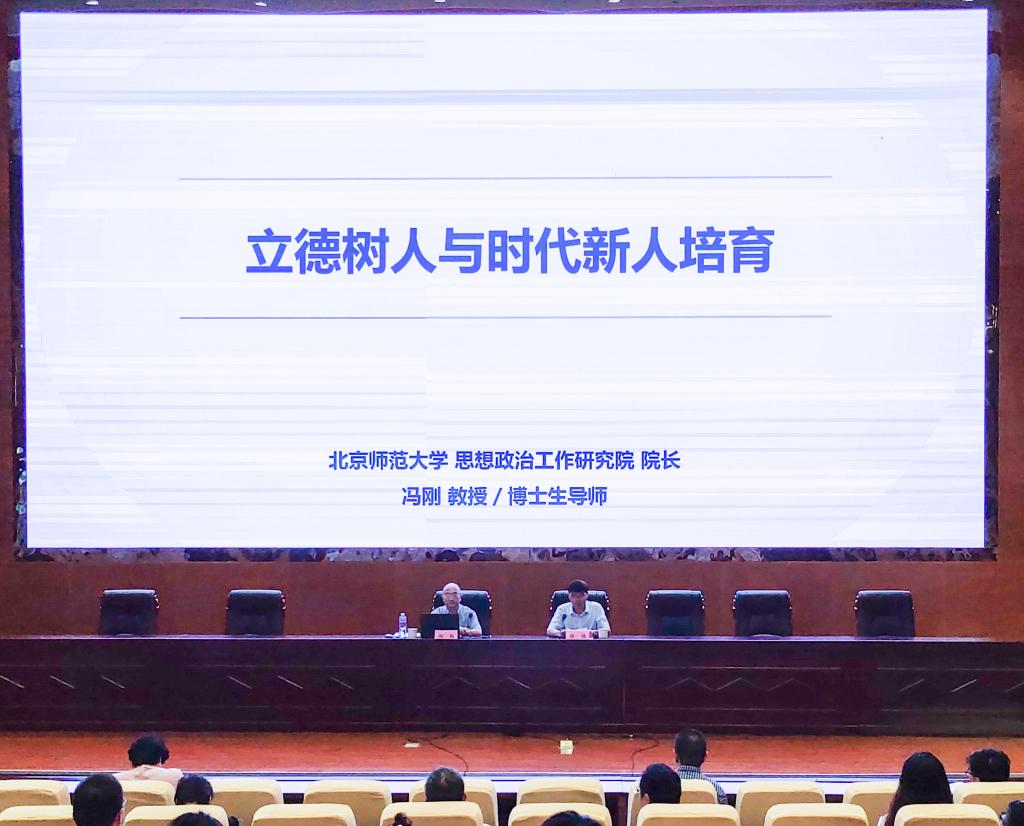 本网讯(特约记者/陈飞)10月4日,原国家教育部思政司司长、北京师范大学思想政治工作研究院院长冯刚教授来校作《立德树人与时代新人培育》专题讲座。党委副书记、工会主席张伟出席报告会,学生处、团委、心理健康教育中心全体人员,马克思主义学院教师代表,各教学院党委副书记及师生代表参加报告会。