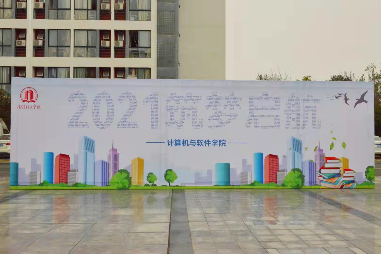 计算机与软件学院结合专业特长,通过软件将所有新生的名字设计成“2021筑梦启航”的字样,新生和家长可以在该特色展板上签名并拍照留念。同时学院发放内容生动详尽的宣传页为新生作入学指引。