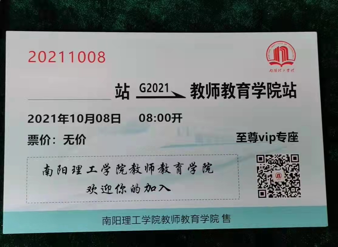 教师教育学院为新生制作了一张“车票”,尽显深情,起点为每个新生的家乡,终点是教师教育学院,票价为无价,让新生们颇为感动。