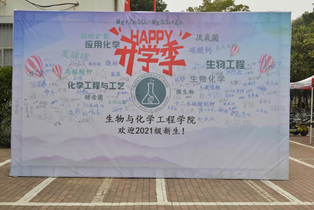 生物与化学工程学院的迎新展板融入了化学专业名词元素并引用网红化学反应方程式“Mg+ZnSO4=Zn+MgSO4”意为“你的镁夺走了我的锌”,将专业性和趣味性有机结合,个性十足。