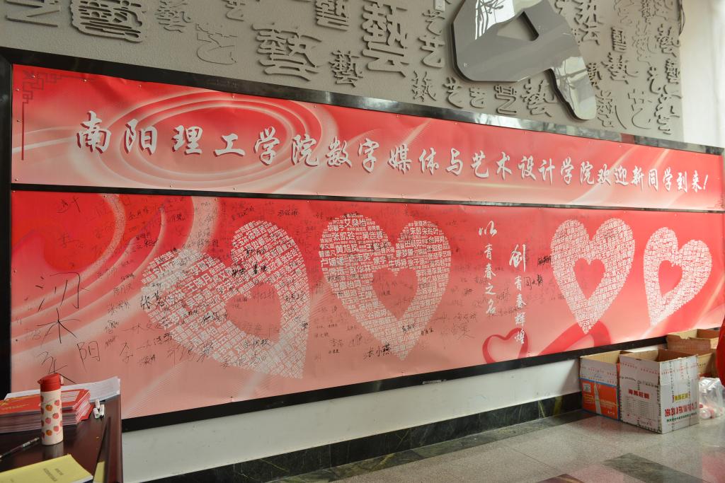 传媒学院制作的特色展板,将新生照片拼成一幅中国地图,并且巧妙融入学院专业特色:摄影机图片代表编导专业,钢笔代表汉语言专业,麦克风代表播音主持专业。同时,学长学姐的深情寄语也让新生倍感温暖。