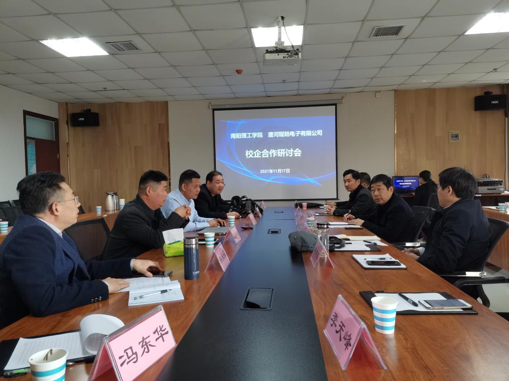本网讯(特约记者/符浩彬)11月17日,唐河耀皓电子有限公司董事长冯兴存、总经理冯兴路、技术总监李金锁带领公司研发团队到校洽谈校企合作事项。