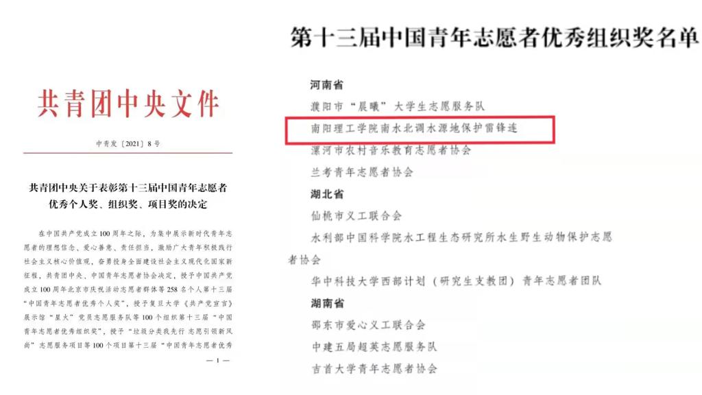 本网讯(特约记者杨双)日前,由共青团中央、中国青年志愿者协会共同主办的第十三届中国青年志愿者优秀组织奖评选结果揭晓,我校南水北调水源地保护雷锋连荣获优秀组织奖。据悉,这也是我校首次荣获青年志愿服务领域的最高荣誉。