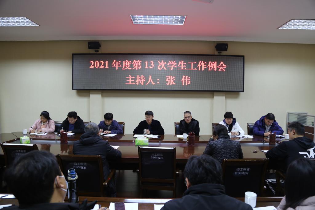 本网讯(特约记者/张启鑫)12月13日下午,校党委副书记、工会主席张伟主持召开我校2021年度第13次学生工作例会。学生处、团委、心理健康教育中心、保卫处、后勤服务中心、校医院等部门主要负责人,各教学院党委副书记参加会议。