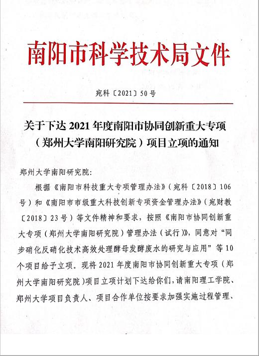 本网讯(特约记者/杜朝军)近日,南阳市科学技术局下发《关于下达2021年度南阳市协同创新重大专项(郑州大学南阳研究院)项目立项的通知》,我校组织申报的《同步硝化反硝化技术高效处理酵母发酵废水的研究与应用》等10个项目获批立项。