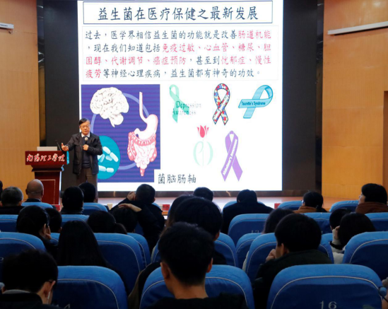 蔡英杰教授以“益生菌在医疗保健之最新发展”为题作学术报告,他从“肠道是人体最重要的免疫器官、肠道菌失衡是代谢症候群的源头、由累肥眠谈益生菌的新功能、菌脑肠轴的奥秘、肠道菌影响大脑发育及功能”五个方面就益生菌对人体健康的影响结合自己的研究成果进行了详细讲述。