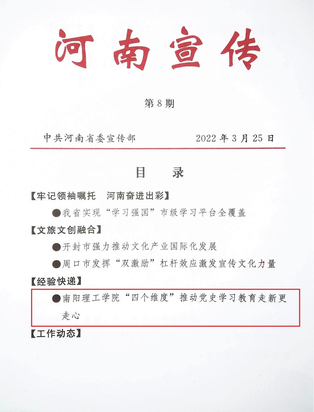 编者按:中共河南省委宣传部2022年3月25日编发的第8期河南宣传对我校“四个维度”推动党史学习教育进行报道。这是省委宣传部对我校开展党史学习教育工作的认可、肯定和鼓励,更是对我校党史学习教育工作的重视、督促和鞭策。现将有关内容刊发如下: