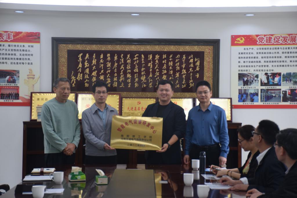 郝好山与河南亚圣电气有限公司、唐河耀皓电子有限公司、南阳格瑞光电科技股份有限公司负责人共同为校企合作研发中心举行揭牌仪式。(校对/王小婉 审核/肖邓华)