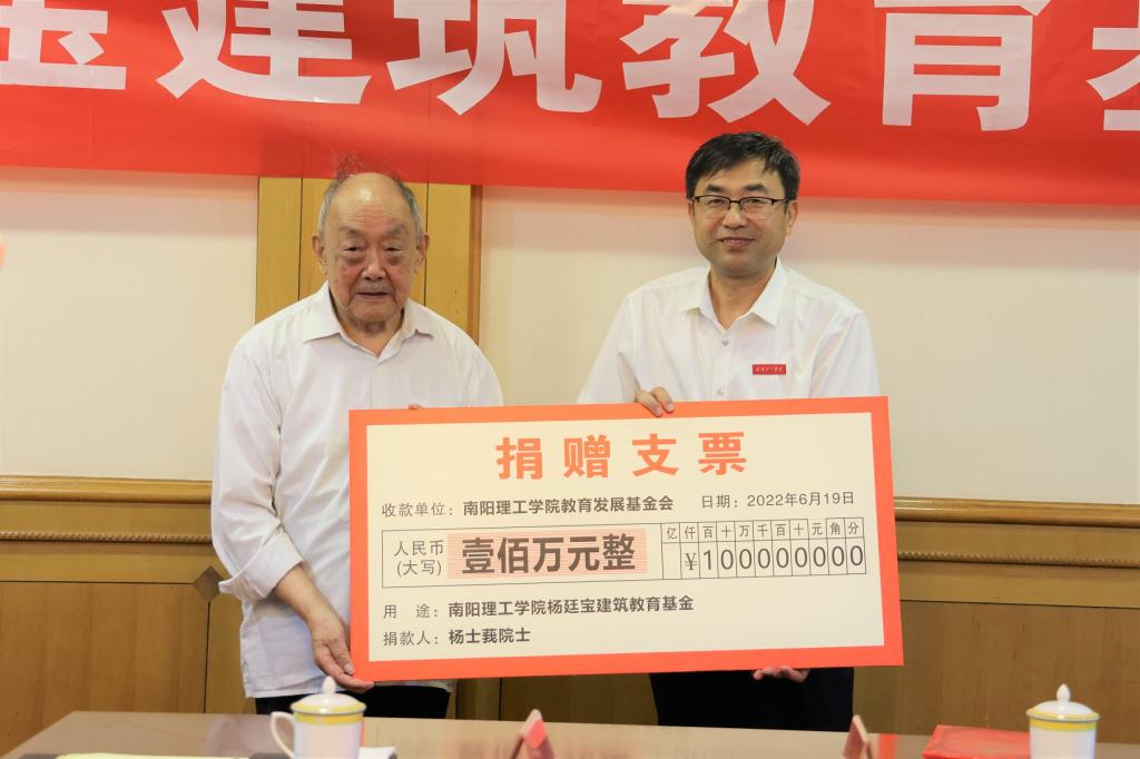 以爱之名,为善之行。南阳理工学院教育发展基金会将充分使用好“杨廷宝建筑教育基金”,切实把杨士莪院士对家乡教育事业的爱心做到有效传递,最大限度发挥基金效益和社会影响力。(校对/肖邓华审核/高芳放)