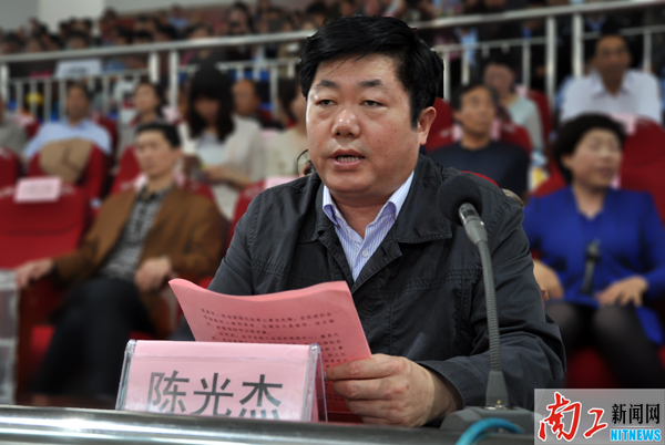 开幕式上,陈光杰代表市委市政府对全市各行各业职工人员致以崇高的敬意和节日的问候,他说此次广播体操比赛是全市广大劳动职工精神文化生活中的一件大事。近年来,全市上下共同贯彻落实党的十八大和十八届三中全会精神,紧紧围绕总体部署,强抓机遇,迎难而上,经济社会发展呈现持续健康的良好形势。这是市委市政府正确领导,全市上下同心同德、奋勇拼搏的结果,更凝聚着广大职工和劳动群众的聪明才智和辛勤汗水。目前,南阳正处于转型跨越,昂头阔斧的关键时期,他希望全市广大干部群众一定要牢记光荣使命,发扬主人翁精神。在推动科学发展上大显身手,在全面深化改革上勇当先锋,在促进社会和谐稳定上做好表率。近年来,全市各级工会组织弘扬社会主义核心价值体系,积极组织开展以提高职工素质、陶冶职工情操为主题的各类文体活动。职工文化和企业文化不断加强,职工队伍整体素质不断提升。市总工会在这里举行广播体操比赛,旨在展示全市广大职工团结拼搏、昂扬向上的精神风貌。倡导自强自立、文明健康的生活理念,激发和鼓励广大职工以更饱满的热情积极投身全面建设小康社会的伟大实践中去。最后,他表示衷心希望各参赛队拼搏进取、团结协作,赛出水平、赛出风格、赛出友谊,取得优异成绩。